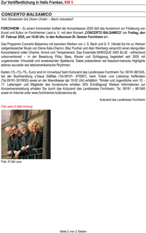 Forchheim (Kulturamt des Landkreises Forchheim). Zu einem fulminanten Auftakt der Konzertsaison 2025 lädt das Kuratorium zur Förderung von Kunst und Kultur im Forchheimer Land e. V. mit dem Konzert „CONCERTO BALSAMICO“ am Freitag, den 07. Februar 2025, um 19.00 Uhr, in den Kulturraum St. Gereon Forchheim ein. Das Programm Concerto Balsamico mit barocken Werken von J. S. Bach und G. F. Händel bis hin zu Werken zeitgenössischer Musik von Elena Kats-Chernin, Blaz Pucihar und Alan Weinberg verspricht einen klangvollen Konzertabend voller Charme, Anmut und Temperament. Das Ensemble BAROQUE AND BLUE - erfrischend unkonventionell - in der Besetzung Flöte, Bass, Klavier und Schlagzeug begeistert seit 2005 mit ungebremster Virtuosität und ansteckender Spiellaune. Dabei präsentieren sie klassisch-barocke Highlights ebenso souverän wie lateinamerikanische Rhythmen.