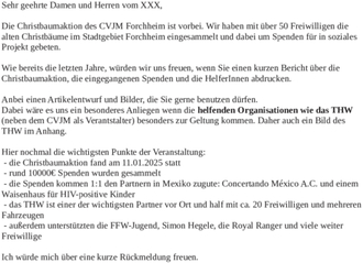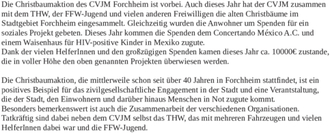 (CVJM Forchheim). Die Christbaumaktion des CVJM Forchheim ist vorbei. Auch dieses Jahr hat der CVJM zusammen mit dem THW, der FFW-Jugend und vielen anderen Freiwilligen die alten Christbäume im Stadtgebiet Forchheim eingesammelt. Gleichzeitig wurden die Anwohner um Spenden für ein soziales Projekt gebeten. Dieses Jahr kommen die Spenden dem Concertando México A.C. und einem Waisenhaus für HIV-positive Kinder in Mexiko zugute. Dank der vielen HelferInnen und den großzügigen Spenden kamen dieses Jahr ca. 10.000 Euro zustande, die in voller Höhe den oben genannten Projekten überwiesen werden. Die Christbaumaktion, die mittlerweile schon seit über 40 Jahren in Forchheim stattfindet, ist ein positives Beispiel für das zivilgesellschaftliche Engagement in der Stadt und eine Verantstaltung, die der Stadt, den Einwohnern und darüber hinaus Menschen in Not zugute kommt. Besonders bemerkenswert ist auch die Zusammenarbeit der verschiedenen Organisationen. Tatkräftig sind dabei neben dem CVJM selbst das THW, das mit mehreren Fahrzeugen und vielen HelferInnen dabei war und die FFW-Jugend.