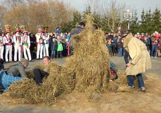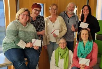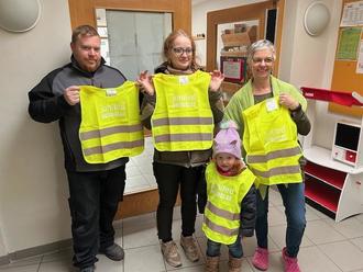 Familie Streng und Birgit Müller (r.), Leitung Kita, bei der Übergabe der Warnwesten.
