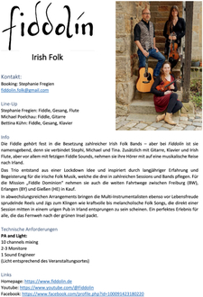 Baiersdorf. Fans des Irish Folk, kommen am Samstag, 5. April 2025 ab 19.30 in der Kulturscheune Baiersdorf (Forchheimer Str. 2) auf ihre Kosten. Die Fiddle gehört fest in die Besetzung zahlreicher Irish Folk Bands - aber bei Fiddolín ist sie namensgebend, denn sie verbindet Stephi, Michael und Tina. Zusätzlich mit Gitarre, Klavier und Irish Flute, aber vor allem mit fetzigen Fiddle Sounds, nehmen sie ihre Hörer mit auf eine musikalische Reise nach Irland. Das Trio entstand aus einer Lockdown Idee und inspiriert durch langjähriger Erfahrung und Begeisterung für die irische Folk Musik, welche die drei in zahlreichen Sessions und Bands pflegen. Für die Mission „Fiddle Dominion“ nehmen sie auch die weiten Fahrtwege zwischen Freiburg (BW), Erlangen (BY) und Gießen (HE) in Kauf. In abwechslungsreichen Arrangements bringen die Multi-Instrumentalisten ebenso vor Lebensfreude sprudelnde Reels und Jigs zum Klingen wie kraftvolle bis melancholische Folk Songs, die direkt einer Session mitten in einem urigen Pub in Irland entsprungen zu sein scheinen. Ein perfektes Erlebnis für alle, die das Fernweh nach der grünen Insel packt. Infos und VVK: www.kusch-baiersdorf.