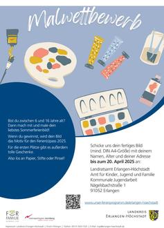 (LRA ERH). Die kommunale Jugendarbeit des Landkreises Erlangen-Höchstadt sucht für das Titelblatt des Ferienpasses des Landkreises wieder ein Motiv eines jungen Künstlers oder einer jungen Künstlerin aus dem Landkreis. Kinder und Jugendliche zwischen sechs und 16 Jahren können bei dem Malwettbewerb mitmachen und ihre Vorschläge samt Name, Alter und Anschrift per Post an Kristin Hittinger, Amt für Kinder Jugend und Familie/Kommunale Jugendarbeit, Nägelsbachstraße 1, 91052 Erlangen bis 20. April 2025 schicken. Das Motiv sollte nicht abgemalt sein und einer Größe von mindestensDIN A 4 entsprechen. Auch Buchgutscheine und weitere Preise gibt es zu gewinnen. Der Ferienpass wird voraussichtlich am ersten Juli 2025 erscheinen. Weitere Informationen gibt es unter der Telefonnummer 09131/803 1525 und auf der Webseite des Ferienpasses unter www.unser-ferienprogramm.de/erlangen-hoechstadt.