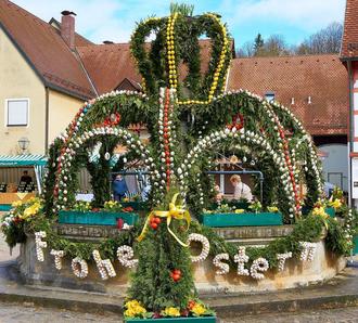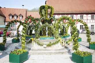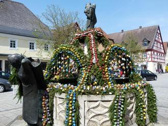 Für eine dieser Traditionen wird schon Wochen vor dem eigentlichen Fest fleißig gewerkelt, gebastelt und gemalt. Schließlich ist viel Arbeit nötig, um einen fränkischen Osterbrunnen kunstvoll mit Tausenden von bunten Eierschalen, mit Blumen, Kränzen und Girlanden zu schmücken. Allerdings werden die Brunnen nicht nur aus Dekorationsgründen zur Zierde. Der Ursprung des Brauchtums liegt in der Bedeutung des nassen und lebensspendenden Elements für die wasserarme Hochebene Frankens, wo natürliche Sammelstellen für das Wasser selten waren – Brunnen und Zisternen dafür umso wichtiger. Mit dem gemeinsam gefertigten Osterschmuck drückt die Dorfgemeinschaft auf kreative Weise ihre Dankbarkeit für das Wasser aus. In voller Pracht zeigen sich die Osterbrunnen meist ab der Karwoche bis etwa zwei Wochen nach Ostersonntag, mancherorts werden sie auch früher geschmückt.