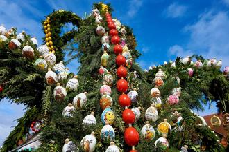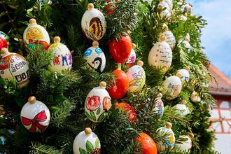 Besonders gut stehen die Chancen auf „Sichtung“ eines solchen Brunnens in der Fränkischen Schweiz, wo rund 200 Orte einen Osterbrunnen ihr Eigen nennen. Bieberbach bei Egloffstein hat es mit dem „größten Osterbrunnen der Welt“ sogar ins Guinness-Buch der Rekorde geschafft – mit exakt 11.108 handbemalten Eierschalen. Auch Heiligenstadt ist einen Besuch wert: Rund um den geschmückten Brunnen am Marktplatz findet alljährlich der große Ostermarkt statt (20. bis 23. April 2025). Am 13. und 26. April 2025 starten in Ebermannstadt außerdem die Osterbrunnenrundfahrten der Tourismuszentrale Fränkische Schweiz (www.fraenkische-schweiz.com/erleben/sehenswert/ostern/osterbrunnen).