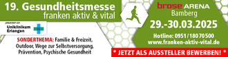 Bamberg (MTB). Ende März fand erneut sehr erfolgreich die mittlerweile 9. Gesundheitsmesse Franken aktiv und vital mit über 110 Ausstellern aus Deutschland, Österreich und Tschechien und knapp 5.500 Besuchern aus großen Teilen Frankens in der brose Arena Bamberg statt.