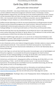 (Forchheim for Future). „DU machst den Unterschied“, unter diesem Motto haben sich auf Initiative von Forchheim for Future e.V. und dem städtischen Klimaschutzmanagement zahlreiche Vereine, Einrichtungen, Schulen, Bürgerinitiativen vorgenommen, den Earth Day wie in den Vorjahren gebührend zu feiern. Diesmal mit dem besonderen Blick auf Kinder und junge Familien. Dazu werden am Samstag, den 03. Mai 2025, in der Innenstadt vielerlei Stände und Aktionen präsentiert, darunter Möglichkeiten zu nachhaltigem Einkauf, Initiativen zur Lebensmittelrettung und für Umweltbildung. Eröffnet wird der Aktionstag um 9.30 Uhr mit einem Klimafrühstück mit Bürgermeisterin Annette Prechtel und dem Klimaschutzmanagement der Stadt Forchheim. Während Erwachsene sich im Stadtteiltreff im Katharinenspital austauschen, dürfen ihre Kinder zusammen mit dem Stadtjugendpfleger im Innenhof spannende Spiele zum Thema Klima und Klimawandel erleben.