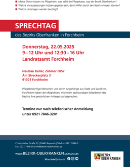 (Bezirk Oberfranken). Welche Hilfen gewährt der Bezirk für Pflegebedürftige? Welche Voraussetzungen müssen gegeben sein, damit Hilfen durch den Bezirk erfolgen können? Im Landratsamt Forchheim bietet der Bezirk Oberfranken am 22. Mai 2025 einen Sprechtag an. Hier können individuelle und persönliche Fragen zur Sozialgesetzgebung im Bereich der Hilfe zur Pflege besprochen werden. Den ganzen Tag über können sich die Bürgerinnen und Bürger mit ihren Fragen an einen sachkundigen Beschäftigten der Sozialverwaltung wenden. Dieser kann zum einen allgemeine Informationen zu einer bevorstehenden Pflegeheimaufnahme geben. Was muss der Antragsteller als erstes tun, welche Unterlagen werden benötigt? Zum anderen können auch ganz individuelle Fragen geklärt werden, zum Beispiel, wenn es um den Einsatz von Vermögen oder Grundbesitz geht. „Oft lassen sich bei diesen Beratungsterminen Vorbehalte und Ängste zerstreuen“, versichert Bezirkstagspräsident Henry Schramm und lädt alle Betroffenen dazu ein, sich persönlich beraten zu lassen. Eingerichtet wurden die Sprechtage des Bezirks Oberfranken in den oberfränkischen Landkreisen vor allem für die Menschen, die nicht die Möglichkeit haben, die Beratungsangebote ihrer Sachbearbeiterinnen und Sachbearbeiter der Sozialhilfeverwaltung in Bayreuth wahrzunehmen. Die Mitarbeiterinnen und Mitarbeiter des Bezirks in Bayreuth stehen den rund 17 000 Menschen, die jährlich Hilfen des Bezirks Oberfranken erhalten, ihren Angehörigen, Betreuern sowie den Beschäftigten von Einrichtungen persönlich und telefonisch für Beratungsgespräche zur Verfügung.