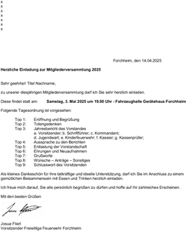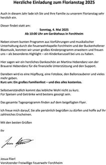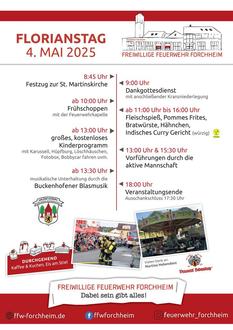 (FFW Forchheim). Am Sonntag, Sonntag, 4. Mai 2025, lädt die Freiwillige Feuerwehr Forchheim zum Florianstag 2025 ein. Ab 10.00 Uhr, wartet am Gerätehaus in Forchheim ein buntes Programm aus Vorführungen und musikalischer Unterhaltung durch die Feuerwehrkapelle Forchheim und der Buckenhofener Blasmusik. Das besondere Highlight in diesem Jahr: ein Kinderkarussell. Dazu ergeht ein herzliches Dankeschön an Martina Hebendanz von der Brauerei Hebendanz für die finanzielle Unterstützung und den Support. Daneben wird es eine Hüpfburg, eine Fotobox, den Ballonzauberer und vieles mehr geben. Kurz um: Ein großes Familienfest - und dies alles kostenlos. Selbstverständlich kommt das leibliche Wohl nicht zu kurz. Für Speisen und Getränke wird bestens gesorgt sein. Die Freiwillige Feuerwehr Forchheim freut sich auf viele Besucher.