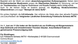 ILE-Managerin Corinna Brauer betont: „Der Genussmarkt ist nicht nur ein Fest für die Sinne, sondern auch eine wertvolle Plattform zum Vernetzen - für Produzenten, Handwerkerinnen und natürlich unsere Gäste.“ Begleitet wird der Markt von einem abwechslungsreichen Kulturprogramm: Neben dem Kirchehrenbacher Musikverein sorgen die Oberfranken Rebellen für Stimmung, und bei der Trachtenschau von Dagmar Rosenbauer und Rosalie Postatny wird’s richtig schick. Auch für die kleinen Gäste ist bestens gesorgt: mit Hüpfburg, Kinderschminken, Glitzersträhnen und sogar "Stempel dir deine Seife". Ein echtes Highlight: die ILE-Infomeile. Hier erfahren die Gäste alles über aktuelle Projekte und Zukunftsideen der Integrierten Ländlichen Entwicklung Fränkische Schweiz AKTIV.