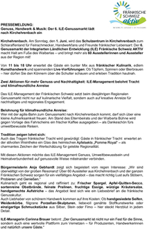 Kirchehrenbach (ILE). Am Sonntag, den 1. Juni, wird das Schulzentrum in Kirchehrenbach zum Schlaraffenland für Feinschmecker, Handwerkfans und Freunde fränkischer Lebensart: Der 6. Genussmarkt der Integrierten Ländlichen Entwicklung (ILE) Fränkische Schweiz AKTIV macht Halt am Fuße des Walberlas - und bringt mehr als 60 Ausstellerinnen und Aussteller aus der Region mit! Von 11 bis 18 Uhr erwartet die Gäste ein bunter Mix aus fränkischer Kulinarik, edlem Kunsthandwerk und spannenden Live-Vorführungen: Ob Töpfern, Spinnen oder Bierbrauen - hier dürfen Sie den Könnern über die Schulter schauen und erleben Tradition hautnah.