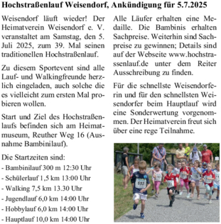 (Heimatverein Weisendorf e.V.). Der Heimatverein Weisendorf e. V. veranstaltet am Samstag, den 5. Juli 2025, zum 39. Mal seinen traditionellen Hochstraßenlauf. Zu diesem Sportevent sind alle Lauf- und Walkingfreunde herzlich eingeladen, auch solche die es vielleicht zum ersten Mal probieren wollen. Start und Ziel des Hochstraßenlaufs befinden sich am Heimatmuseum, Reuther Weg 16 (Ausnahme Bambinilauf).