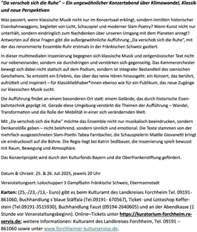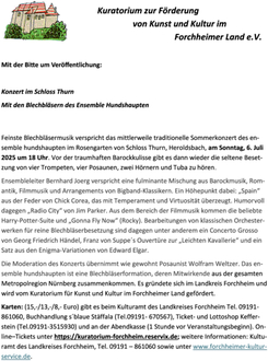 (Kuratorium zur Förderung zur Förderung von Kunst und Kultur im Forchheimer Land e.V.). Das Kuratorium zur Förderung zur Förderung von Kunst und Kultur im Forchheimer Land e.V. präsentiert im Juli ein Konzert im Schloss Thurn mit den Blechbläsern des Ensemble Hundshaupten. Feinste Blechbläsermusik verspricht das mittlerweile traditionelle Sommerkonzert des ensemble hundshaupten im Rosengarten von Schloss Thurn, Heroldsbach, am Sonntag, 6. Juli 2025 um 18 Uhr. Vor der traumhaften Barockkulisse gibt es dann wieder die seltene Besetzung von vier Trompeten, vier Posaunen, zwei Hörnern und Tuba zu hören. Ensembleleiter Bernhard Joerg verspricht eine fulminante Mischung aus Barockmusik, Romantik, Filmmusik und Arrangements von Bigband-Klassikern. Ein Höhepunkt dabei: „Spain“ aus der Feder von Chick Corea, das mit Temperament und Virtuosität überzeugt. Humorvoll dagegen „Radio City“ von Jim Parker. Aus dem Bereich der Filmmusik kommen die beliebte Harry-Potter-Suite und „Gonna Fly Now“ (Rocky). Bearbeitungen von klassischen Orchesterwerken für reine Blechbläserbesetzung sind dagegen unter anderem ein Concerto Grosso von Georg Friedrich Händel, Franz von Suppe´s Ouvertüre zur „Leichten Kavallerie“ und ein Satz aus den Enigma-Variationen von Edward Elgar. Die Moderation des Konzerts übernimmt wie gewohnt Posaunist Wolfram Weltzer. Das ensemble hundshaupten ist eine Blechbläserformation, deren Mitwirkende aus der gesamten Metropolregion Nürnberg zusammenkommen. Es gründete sich im Landkreis Forchheim und wird vom Kuratorium für Kunst und Kultur im Forchheimer Land gefördert. Karten: (15,-/13,-/8,- Euro) gibt es beim Kulturamt des Landkreises Forchheim Tel. 09191/861060, Buchhandlung s´blaue Stäffala (Tel.09191/670567), Ticket- und Lottoshop Kefferstein (Tel.09191/3515930) und an der Abendkasse (1 Stunde vor Veranstaltungsbeginn). Online-Tickets unter www.kuratorium-forchheim.reservix.de; weitere Informationen: Kulturamt des Landkreises Forchheim, Tel. 09191/861060 sowie unter www.forchheimer-kulturservice.de.