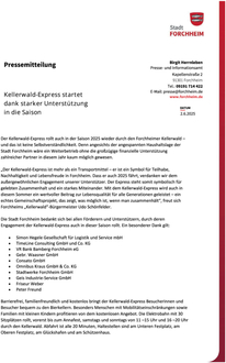 (Stadt Forchheim). Der Kellerwald-Express rollt auch in der Saison 2025 wieder durch den Forchheimer Kellerwald - und das ist keine Selbstverständlichkeit. Denn angesichts der angespannten Haushaltslage der Stadt Forchheim wäre ein Weiterbetrieb ohne die großzügige finanzielle Unterstützung zahlreicher Partner in diesem Jahr kaum möglich gewesen. „Der Kellerwald-Express ist mehr als ein Transportmittel - er ist ein Symbol für Teilhabe, Nachhaltigkeit und Lebensfreude in Forchheim. Dass er auch 2025 fährt, verdanken wir dem außergewöhnlichen Engagement unserer Unterstützer. Der Express steht somit symbolisch für gelebten Zusammenhalt und ein starkes Miteinander. Mit dem Kellerwald-Express wird auch in diesem Sommer ein wertvoller Beitrag zur Lebensqualität für alle Generationen geleistet - ein echtes Gemeinschaftsprojekt, das zeigt, was möglich ist, wenn man zusammenhält“, freut sich Forchheims „Kellerwald“-Bürgermeister Udo Schönfelder. Die Stadt Forchheim bedankt sich bei allen Förderern und Unterstützern, durch deren Engagement der Kellerwald-Express auch in dieser Saison rollt. Ein besonderer Dank gilt: