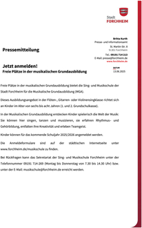 (Stadt Forchheim). Freie Plätze in der musikalischen Grundausbildung bietet die Sing- und Musikschule der Stadt Forchheim für die Musikalische Grundausbildung (MGA). Dieses Ausbildungsangebot in der Flöten-, Gitarren- oder Violinensingklasse richtet sich an Kinder im Alter von sechs bis acht Jahren (1. und 2. Grundschulkasse). In der Musikalischen Grundausbildung entdecken Kinder spielerisch die Welt der Musik: Sie können hier singen, tanzen und musizieren, sie erfahren Rhythmus- und Gehörbildung, entfalten ihre Kreativität und erleben Teamgeist. Kinder können für das kommende Schuljahr 2025/2026 angemeldet werden. Die Anmeldeformulare sind auf der städtischen Internetseite unter www.forchheim.de/musikschule zu finden. Bei Rückfragen kann das Sekretariat der Sing- und Musikschule Forchheim unter der Telefonnummer 09191 714-269 (Montag bis Donnerstag von 7.30 bis 14.30 Uhr) bzw. unter der E-Mail: musikschule@forchheim.de erreicht werden.