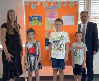 Kristin Hittinger von der Kommunalen Jugendarbeit (li.) und Landrat Alexander Tritthart (re.) gratulierten dem Sieger des Ferienpass-Malwettbewerbs Marvin Birnitzer (Mi.) aus Lonnerstadt, Alva Gerum aus Hemhofen zum zweiten sowie Lukas Carpenter aus Heßdorf zum dritten Platz.
