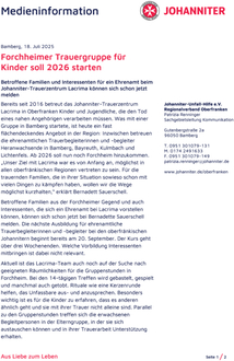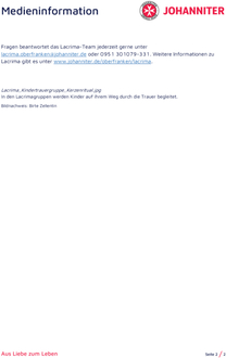 (Johanniter-Unfall-Hilfe e.V. Regionalverband Oberfranken). Bereits seit 2016 betreut das Johanniter-Trauerzentrum Lacrima in Oberfranken Kinder und Jugendliche, die den Tod eines nahen Angehörigen verarbeiten müssen. Was mit einer Gruppe in Bamberg startete, ist heute ein fast flächendeckendes Angebot in der Region: Inzwischen betreuen die ehrenamtlichen Trauerbegleiterinnen und -begleiter Heranwachsende in Bamberg, Bayreuth, Kulmbach und Lichtenfels. Ab 2026 soll nun noch Forchheim hinzukommen. „Unser Ziel mit Lacrima war es von Anfang an, möglichst in allen oberfränkischen Regionen vertreten zu sein. Für die trauernden Familien, die in ihrer Situation sowieso schon mit vielen Dingen zu kämpfen haben, wollen wir die Wege möglichst kurzhalten,“ erklärt Bernadett Sauerschell. Betroffene Familien aus der Forchheimer Gegend und auch Interessenten, die sich ein Ehrenamt bei Lacrima vorstellen können, können sich schon jetzt bei Bernadette Sauerschell melden. Die nächste Ausbildung für ehrenamtliche Trauerbegleiterinnen und -begleiter bei den oberfränkischen Johannitern beginnt bereits am 20. September. Der Kurs geht über drei Wochenenden. Welche Vorbildung Interessenten mitbringen ist dabei nicht relevant. Aktuell ist das Lacrima-Team auch noch auf der Suche nach geeigneten Räumlichkeiten für die Gruppenstunden in Forchheim. Bei den 14-tägigen Treffen wird gebastelt, gespielt und manchmal auch getobt. Rituale wie eine Kerzenrunde helfen, das Unfassbare aus- und anzusprechen. Besonders wichtig ist es für die Kinder zu erfahren, dass es anderen ähnlich geht und sie mit ihrer Trauer nicht alleine sind. Parallel zu den Gruppenstunden treffen sich die erwachsenen Begleitpersonen in der Elterngruppe, in der sie sich austauschen können und in ihrer Trauerarbeit Unterstützung erhalten. Fragen beantwortet das Lacrima-Team jederzeit gerne unter lacrima.oberfranken@johanniter.de oder 0951 301079-331. Weitere Informationen zu Lacrima gibt es unter www.johanniter.de/oberfranken/lacrima.