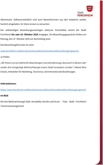 Als Dankeschön erwartet die Engel ein professionelles Fotoshooting im Engelsgewand sowie ein exklusives Haarstyling durch Friseur Schlenkrich. Zudem dürfen sie sich am Ende ihrer Amtszeit über eine besondere Überraschung freuen. Wer kann Weihnachtsengel werden? Gesucht werden junge Menschen zwischen 15 und 25 Jahren, die aus Forchheim oder der Region stammen, kommunikativ sind und Freude daran haben, im Rampenlicht zu stehen. Wichtig ist auch genügend Zeit für die zahlreichen Auftritte während der Adventszeit. Selbstverständlich sind auch Bewerberinnen aus den Vorjahren wieder herzlich eingeladen, ihr Glück erneut zu versuchen. Die vollständigen Bewerbungsunterlagen inklusive Portraitfoto nimmt die Stadt Forchheim bis zum 19. Oktober 2025 entgegen. Die Bewerbungsgespräche finden am Montag, den 27. Oktober 2025 am Nachmittag statt.