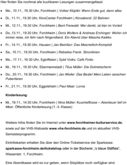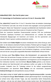(VHS des Landkreises Forchheim). Der „blätterWALD“ kommt! Vom 10. bis 21. November finden die beliebten Literaturtage im Forchheimer Land statt, wie immer mit einem breit angelegten und bunt gemischten Programm. Neben den "klassischen" Lesungen aus Belletristik oder Sachbüchern stehen ein musikalisch-literarischer Abend sowie ein Kinoabend auf dem Programm. Dank der inzwischen bewährten Zusammenarbeit zwischen VHS des Landkreises Forchheim, Sparkasse Forchheim und Volkshochschule e.V. erwarten Sie wieder interessante Begegnungen mit Autorinnen und Autoren, die ihre spannenden und aktuellen Texte im ganzen Landkreis präsentieren werden.