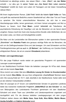 Für das junge Publikum wurde wieder ein gesondertes Programm mit spannenden Lesungen zusammengestellt. In der Stadtbücherei Forchheim finden die beliebten Lesungen für KiTas statt, dieses Jahr mit der Autorin Suza Kolb. Hinzu kommt zum ersten Mal eine öffentliche Lesung für Kinder im Grundschulalter mit der Autorin Nina Müller, die aus ihren erfolgreichen „Kuschelflosse“-Büchern lesen wird. Die Lesung findet am 19.11. statt, ebenfalls in der Stadtbücherei. Karten dafür sind an den üblichen Verkaufsstellen erhältlich. Über 30 Lesungen an 27 Grund- und weiterführenden Schulen im gesamten Landkreis bietet das inzwischen traditionelle Programm „blätterWALD an den Schulen“ an, das vom Bildungsbüro des Landratsamts Forchheim gemeinsam mit dem Staatlichen Schulamt und einem Team aus Lehrkräften und Literaturexpertinnen organisiert und durchgeführt wird. Für die überaus beliebten Lesebegegnungen mit dem jungen Publikum stehen dieses Jahr Meike Haas, Suza Kolb, Nina Müller, Martin Muser, Annika Scheffel und Kathrin Schrocke bereit.