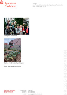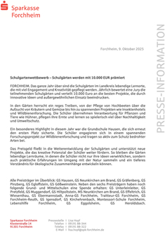(Sparkasse Forchheim). Das ganze Jahr über sind die Schulgärten im Landkreis lebendige Lernorte, die mit viel Engagement und Kreativität gepflegt werden. Jährlich bewertet eine Jury die teilnehmenden Schulgärten und verteilt 10.000 Euro an die besten Projekte, die durch innovative Ideen und außergewöhnlichen Einsatz beeindrucken. In den Gärten herrscht ein reges Treiben, von der Pflege von Hochbeeten über die Aufzucht von Kräutern und Gemüse bis hin zu spannenden Projekten wie Insektenhotels und Wildbienenforschung. Die Schüler übernehmen Verantwortung für Pflanzen und Tiere wie Hühner, pflegen ihre Ernte und lernen so spielerisch viel über Nachhaltigkeit und Umweltschutz. Ein besonderes Highlight in diesem Jahr war die Grundschule Hausen, die sich erneut den ersten Platz sicherte. Die Schüler engagieren sich in einem spannenden Forschungsprojekt zur Wildbienenforschung und tragen so aktiv zum Schutz bedrohter Arten bei. Das Preisgeld fließt in die Weiterentwicklung der Schulgärten und unterstützt neue Projekte, die das kreative Potenzial der Schüler weiter fördern. So bleiben die Gärten lebendige Lernräume, in denen die Schüler nicht nur ihre Ideen verwirklichen, sondern auch praktische Erfahrungen im Umgang mit der Natur sammeln und ein tieferes Verständnis für ökologische Zusammenhänge entwickeln können. Alle Preisträger im Überblick: GS Hausen, GS Neunkirchen am Brand, GS Gräfenberg, GS Pinzberg, GS Egloffstein, GS Gößweinstein. Neben den sechs Preisträgern haben noch folgende Grund- und Mittelschulen eine Spende erhalten: GS Unterleinleiter, GS Pretzfeld, GS Muggendorf, GS Hiltpoltstein, MS Neunkirchen am Brand, GS Effeltrich, GS Wiesenthau, GS Ebermannstadt, Anna-GS Forchheim, Traitteur-GS Forchheim, GS Forchheim-Reuth, GS Igensdorf, GS Kirchehrenbach, Montessori-Schule Forchheim, Lebenshilfe Forchheim, GS Eggolsheim, GS Heroldsbach.