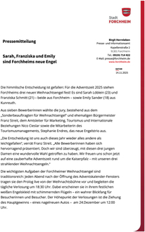 (Stadt Forchheim). Die himmlische Entscheidung ist gefallen: Für die Adventszeit 2025 stehen Forchheims drei neuen Weihnachtsengel fest! Es sind Sarah Löblein (23) und Franziska Schmitt (21) - beide aus Forchheim - sowie Emily Sander (18) aus Kunreuth. Aus sieben Bewerberinnen wählte die Jury, bestehend aus dem „Sonderbeauftragten für Weihnachtsengel“ und ehemaligen Bürgermeister Franz Streit, dem Amtsleiter für Marketing, Tourismus und Internationale Beziehungen Nico Cieslar sowie die Mitarbeiterin des Tourismusmanagements, Stephanie Endres, das neue Engelstrio aus. „Die Entscheidung ist uns auch dieses Jahr wieder alles andere als leichtgefallen“, verrät Franz Streit. „Alle Bewerberinnen haben sich hervorragend präsentiert. Doch wir sind überzeugt, mit diesen drei jungen Damen eine wundervolle Wahl getroffen zu haben. Wir freuen uns schon jetzt auf eine zauberhafte Adventszeit rund um die Kaiserpfalz - mit unseren drei strahlenden Weihnachtsengeln.“