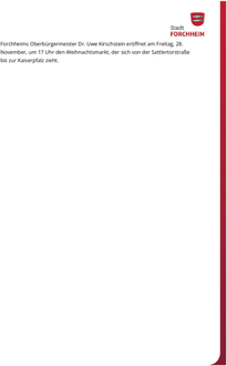 Die wichtigsten Aufgaben der Forchheimer Weihnachtsengel sind traditionsreich: Jeden Abend nach der Öffnung des Adventskalender-Fensters tragen sie den Prolog live von der Weihnachtsbühne vor und begleiten die tägliche Verlosung um 18.30 Uhr. Dabei erscheinen sie in ihrem festlichen weißen Engelskleid mit schimmernden Flügeln - ein wahrer Blickfang für Besucherinnen und Besucher. Der Höhepunkt der Verlosungen ist die Ziehung des Hauptgewinns - eines nagelneuen Autos - am 24.Dezember um 12.00 Uhr. Forchheims Oberbürgermeister Dr. Uwe Kirschstein eröffnet am Freitag, 28. November, um 17 Uhr den Weihnachtsmarkt, der sich von der Sattlertorstraße bis zur Kaiserpfalz zieht.