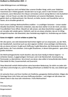 Die Weihnachtsgeschichte macht deutlich, dass das Gute häufig im Kleinen beginnt - in einfachen Gesten, in gegenseitigem Vertrauen und in der Bereitschaft, Verantwortung füreinander zu übernehmen. Sie erinnert uns daran, dass selbst in herausfordernden Zeiten Platz bleibt für Mut, Zusammenhalt und Zuversicht.
