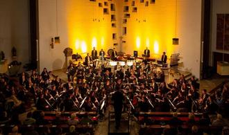 Die 75-köpfige Bläserphilharmonie Forchheim im Altarraum der Pfarrkirche St. Josef.