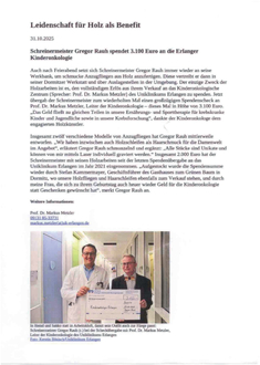 (Uniklinikum Erlangen/Kinderklinik). Auch nach Feierabend setzt sich Schreinermeister Gregor Rauh immer wieder an seine Werkbank, um schmucke Anzugfliegen aus Holz anzufertigen. Diese vertreibt er dann in seiner Dormitzer Werkstatt und über Auslagestellen in der Umgebung. Der einzige Zweck der Holzarbeiten ist es, den vollständigen Erlös aus ihrem Verkauf an das Kinderonkologische Zentrum (Sprecher: Prof. Dr. Markus Metzler) des Uniklinikums Erlangen zu spenden. Im vergangenen Jahr übergab der Schreinermeister zum wiederholten Mal einen großzügigen Spendenscheck an Prof. Dr. Markus Metzler, Leiter der Kinderonkologie – dieses Mal in Höhe von 3.100 Euro. „Das Geld fließt zu gleichen Teilen in unsere Ernährungs- und Sporttherapie für krebskranke Kinder und Jugendliche sowie in unsere Krebsforschung“, dankte der Kinderonkologe dem engagierten Holzkünstler. Insgesamt zwölf verschiedene Modelle von Anzugfliegen hat Gregor Rauh mittlerweile entworfen. „Wir haben inzwischen auch Holzschleifen als Haarschmuck für die Damenwelt im Angebot“, erläutert Gregor Rauh schmunzelnd und ergänzt: „Alle Stücke sind Unikate und können von mir mittels Laser individuell graviert werden.“ Insgesamt 2.000 Euro hat der Schreinermeister mit seinen Holzarbeiten seit der letzten Spendenübergabe an das Uniklinikum Erlangen im Jahr 2021 eingenommen. „Aufgestockt wurde die Spendensumme wieder durch Stefan Kammermayer, Geschäftsführer des Gasthauses zum Grünen Baum in Dormitz, wo unsere Holzfliegen und Haarschleifen ebenfalls zum Verkauf stehen, und durch meine Frau, die sich zu ihrem Geburtstag auch heuer wieder Geld für die Kinderonkologie statt Geschenken gewünscht hat“, merkt Gregor Rauh an.