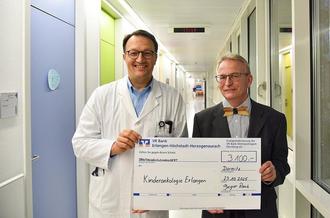 In Hemd und Sakko statt in Arbeitskluft, damit sein Outfit auch zur Fliege passt: Schreinermeister Gregor Rauh (r.) bei der Scheckübergabe mit Prof. Dr. Markus Metzler, Leiter der Kinderonkologie des Uniklinikums Erlangen.