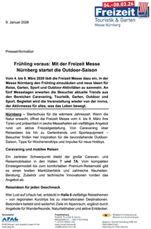 (Nürnberg/AFAG). Startschuss für die wärmere Jahreszeit: Wenn die Natur erwacht, öffnet die Freizeit Messe vom 4. bis 8. März ihre Türen und präsentiert in sechs Messehallen ein vielfältiges Angebot rund um aktive Freizeitgestaltung. Von Caravaning über Reiseideen bis hin zu Gartentrends und Sportequipment - Besucher finden hier Inspiration für die bevorstehende Outdoor- Saison, Tipps für Wochenendtrips und Impulse für neue Hobbys.