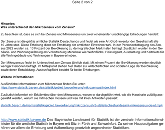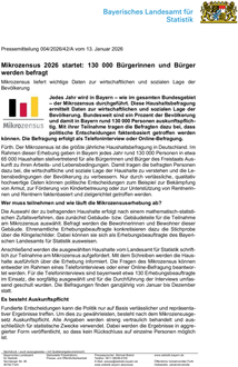 (Bayerisches Landesamt für Statistik). Jedes Jahr wird in Bayern - wie im gesamten Bundesgebiet - der Mikrozensus durchgeführt. Diese Haushaltsbefragung ermittelt Daten zur wirtschaftlichen und sozialen Lage der Bevölkerung. Bundesweit sind ein Prozent der Bevölkerung und damit in Bayern rund 130 000 Personen auskunftspflichtig. Mit ihrer Teilnahme tragen die Befragten dazu bei, dass politische Entscheidungen faktenbasiert getroffen werden können. Die Befragung erfolgt als Telefoninterview oder Online-Befragung. Fürth. Der Mikrozensus ist die größte jährliche Haushaltsbefragung in Deutschland. Im Rahmen dieser Erhebung geben in Bayern jedes Jahr rund 130.000 Personen in etwa 65.000 Haushalten stellvertretend für alle Bürgerinnen und Bürger des Freistaats Auskunft zu ihren Arbeits- und Lebensbedingungen. Damit tragen die befragten Personen dazu bei, die wirtschaftliche und soziale Lage der Haushalte zu verstehen und die Lebensbedingungen der Bevölkerung zu verbessern. Nur durch verlässliche, qualitativ hochwertige Daten können politische Entscheidungen zum Beispiel zur Bekämpfung von Armut, zur Förderung von Kinderbetreuung oder zur Unterstützung von Rentnerinnen und Rentnern faktenbasiert und zielgerichtet getroffen werden.
