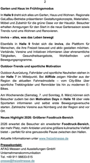 Ebenfalls in Halle 9 findet sich die inviva, die Plattform für Menschen, die ihre Freizeit bewusst und aktiv gestalten möchten. Verbände, Vereine und Initiativen informieren über ehrenamtliche Tätigkeiten, Gesundheitsangebote, Wohlbefinden und Bewegungsprogramme.