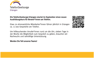 (TelefonSeelsorge Erlangen). Die TelefonSeelsorge Erlangen startet im September 2026 einen neuen Ausbildungskurs für Berater*innen am Telefon. Gut 70 ehrenamtliche Mitarbeiter*innen führen jährlich ca. 11.000 Gespräche mit Anrufer*innen. Um hilfesuchenden Anrufer*innen rund um die Uhr, sieben Tage in der Woche die Möglichkeit zum Gespräch zu geben, brauchen wir Nachwuchs und tatkräftige Unterstützung. Werden Sie Teil unseres Teams. Kontakt unter: kontakt@telefonseelsorge-erlangen.de oder Tel. 09131/97 98 30.