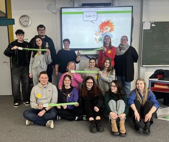 Die Schulklasse mit Christine Fuchs Koordinatorin vom Erlanger Hospizverein (oben re.).