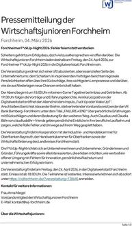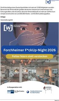 (Wirtschaftsjunioren Forchheim). Scheitern gehört zum Erfolg dazu, doch viel zu selten sprechen wir offen darüber. Die Wirtschaftsjunioren Forchheim laden deshalb am Freitag, den 24. April 2026, zur Forchheimer F*ckUp-Night 2026 in die Digitalwerkstatt Forchheim ein. Die Veranstaltung widmet sich einer oft tabuisierten, aber essenziellen Seite des Unternehmertums: dem Scheitern. In inspirierenden Vorträgen berichten regionale Persönlichkeiten offen über ihre Rückschläge, ihre wichtigsten Lernprozesse und darüber, wie sie aus Niederlagen neue Chancen entwickelt haben.