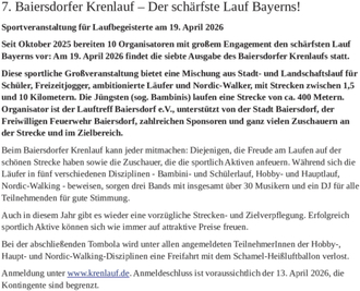 (Lauftreff Baiersdorf e.V.). Seit Oktober 2025 bereiten 10 Organisatoren mit großem Engagement den schärfsten Lauf Bayerns vor: Am 19. April 2026 findet die siebte Ausgabe des Baiersdorfer Krenlaufs statt. Diese sportliche Großveranstaltung bietet eine Mischung aus Stadt- und Landschaftslauf für Schüler, Freizeitjogger, ambitionierte Läufer und Nordic-Walker, mit Strecken zwischen 1,5 und 10 Kilometern. Die Jüngsten (sog. Bambinis) laufen eine Strecke von ca. 400 Metern. Organisator ist der Lauftreff Baiersdorf e.V., unterstützt von der Stadt Baiersdorf, der Freiwilligen Feuerwehr Baiersdorf, zahlreichen Sponsoren und ganz vielen Zuschauern an der Strecke und im Zielbereich.