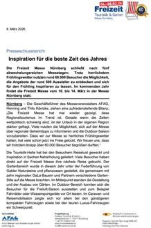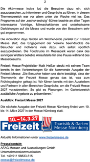 Die nächste Ausgabe der Freizeit Messe Nürnberg findet vom 10. bis 14. März 2027 in der Messe Nürnberg statt. Aktuelle Informationen unter www.freizeitmesse.de.