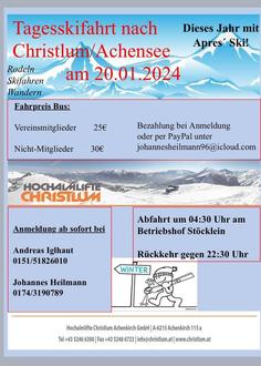 Abfahrt ist am 20.01.2024 um 04:30 Uhr vom Betriebshof der Fa. Stöcklein aus. Die Rückkehr nach Hausen wird gegen 22:30 Uhr erwartet. Eine Brotzeit ist im Buspreis (25€ für Vereinmitglieder, 30€ für Nicht-Mitglieder) inbgegriffen.