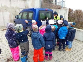 Herr Fleischmann holte die Vorschulkinder in der Kita St. Wolfgang ab. Nach dem theoretischen Teil, einem Gespräch über die wichtigsten Regeln im Straßenverkehr, starteten wir zu Fuß Richtung Ampelanlage. Viel gab es zu beachten, z. B. immer in Hofeinfahrten blicken, auch bei Ampel und Zebrastreifen warten, ob alle Autos stehen bleiben, nicht zu nah an der Fahrbahn treten und vieles mehr.