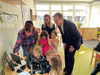 Kindergartenleiterin Monika Köhler, Elternbeiratsvositzende Ana Krestel und Filialleiter der Häusner Volksbank Thorsten Erlwein zusammen mit den Kindergartenkindern beim inspizieren einer Feder mit dem neuen Mikroskop.