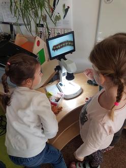 Mikroskope, Foto und Laptop haben einen festen Platz bei uns in der Gruppe gefunden und stehen den Kindern jederzeit zum sofortigen Forschungseinsatz zur Verfügung, Durch die großen Bildschirme die die Okulare ersetzen ist es immer möglich, dass mehrere Kinder gleichzeitig schauen können. Darüber hinaus sind Sie mittlerweile in der Bedienung der Geräte so gut, dass Sie auch schon selbständig damit experimentieren und hantieren können.