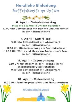 | 05:30 Uhr | Feier der Osternacht mit Abendmahl in der Heilandskirche in Hemhofen (Pfarrerin Laura Stöhler) mit anschließendem Osterfrühstück im Gemeindehaus in Hemhofen |