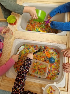 Unsere Krippenkinder erfreuen sich an einem Spielwannentisch. Dieser lädt zum Spielen und Verweilen ein. Allein oder mit den Freunden kann man dort eine Sinneserfahrung erleben.