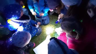 Für die zukünftigen Schulkinder der Kita St. Wolfgang stand am 24.03.2023 die langersehnte Nachtwanderung an. Mit aufgeregten Kindern starteten wir um 17:30 Uhr in der Kindertagesstätte. Als Stärkung gab es für alle erst einmal Wienerle und Brötchen. Anschließend trafen wir uns in der dunklen Turnhalle um die Geschichte „Es klopft bei Wanja in der Nacht“ zu hören, diese wurde durch einen Projektor groß an der Wand verbildlicht. In der Geschichte lernten die Kinder Wanja kennen, der in einer kalten Winternacht einem Bären, einem Fuchs und einem Hasen Zuflucht in seiner Hütte gewährte. Die Tiere versprechen Wanja während der Nacht Frieden zu halten, am nächsten Morgen sind die drei verschwunden jedoch findet Wanja noch die Spuren der Tiere im Schnee. Nach der Geschichte war es für uns soweit, wir begaben uns auf Spurensuche vor der Kindertagesstätte. Wir fanden auf unseren Weg durch Hausen viele Spuren und Hinweise, es galt Rätsel zu lösen und viele Aufgaben zu bewältigen. Begeistert leuchteten wir uns mit unseren Taschenlampen den Weg und fanden zusammen am Ende einen tollen Schatz. Nach unserer Nachtwanderung wärmten wir uns noch im Kindergarten mit Kinderpunsch auf, bis um 20:30 Uhr alle abgeholt wurden.