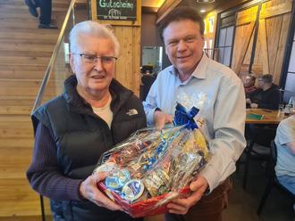 Christoph Seidel beim Überreichen des Geschenkkorbes an "Addi" Minet