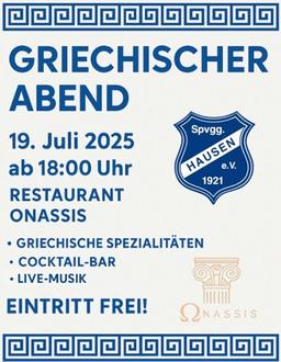 Am Samstag, den 19.Juli 2025 ab 18Uhr veranstalten wir zusammen mit unserem neuen Sportheim-Wirt einen „GRIECHISCHEN ABEND“ mit köstenlichen Spezialitäten, Cocktail-Bar und LIVE-Musik einer griechischen Band!!!