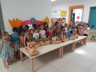 Zurück im „Zeltlager“ wurde jeder einzelne Wagon mit den darin enthaltenen Lebensmitteln besprochen. Selbstverständlich durften dabei entsprechende Kostproben nicht fehlen und so manches Kind entdeckte das gesundes Essen auch gut sein kann (Obstteller, Rohkostsalat, Brötchen und Brot mit Körnern aus dunklem Mehl gebacken, Buttermilchdrink, Teelimonade, Wurst-/Gemüsespieße,…).