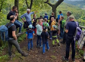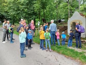 Nachdem alle auf privat-PKW`s aufgeteilt waren, ging es zum Wanderparkplatz an der St. Moritzkapelle oberhalb von Leutenbach. Von dort aus ging es entlang eines schönen Wanderweges über den Burgstein, mit herrlicher Aussicht auf Walberla und Rodenstein, nach Ortspitz zum Peterhof. Hier wurde die Bedeutung der Streuobstwiesen in der Fränkischen Schweiz näher erläutert. Nach einer Stärkung mit leckerem Apfelsaft vom Peterhof ging es über die Sinterterrassen wieder zurück zur Moritzkapelle. Dort angekommen erfuhren die Kinder und die Papas und Opas etwas über die Geschichte und die Sagen rund um die Moritzkapelle.