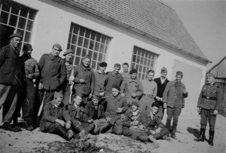 Als Erstes zeige ich das Bild, auf dem die französischen Kriegsgefangenen von Hausen abgebildet sind, die den Bauern als Helfer auf den Feldern zur Verfügung standen. Hinter den Gefangenen ist das Lagergebäude der Genossenschaft ELEKTRA auf dem Grundstück Haus-Nr. 183 (heute: Friedhofsstraße 10a) zu sehen, das 1940 entstand und zur Unterkunft der Gefangenen umgebaut worden war. Inzwischen ist das Gebäude abgerissen.