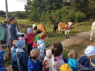 Wenn wir die Tür unserer Kita öffnen haben wir einen hervorragenden Blick auf eine kleine Kuhherde. Was liegt also näher, als diesen einen Besuch abzustatten und die Milch der Kühe zu unserem Erntedankprojekt zu machen.